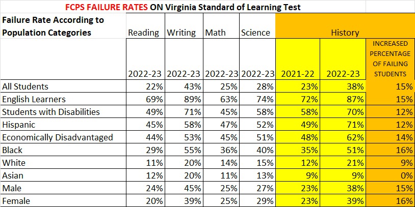 Failure rates for Fairfax County Public Schools for Standards of Learning Tests for all subjects are troubling. But what is happening in History? From 2021-22 to 2022-23, the failure rates of every group, except Asians, increased. What could possibly have happened? The Fairfax Schools Monitor has been digging into what is happening with the Social Studies Curriculum and parents are not happy.