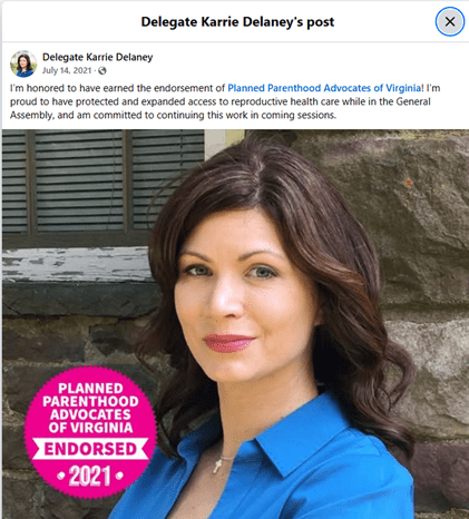 Karrie Delaney has scrubbed her website to appear as a moderate mother who just cares for children. She does not show up for candidate forums in her District. For four years, parishioners from St. Timothy and St. Veronica Catholic Churches have scheduled meetings with Delaney for Pro-Life Advocacy Day. Each time, after making the two-hour trip to Richmond, the delegation was informed upon arrival that Delegate Delaney is unavailable to meet because of a last-minute meeting. Other Democrat and Republican members, who also had meetings, made efforts to meet constituents if even for a few minutes as they stepped out of a meeting. Common courtesy would assume that Delaney’s office would make an attempt to contact the person who arranged the meeting ahead of time.