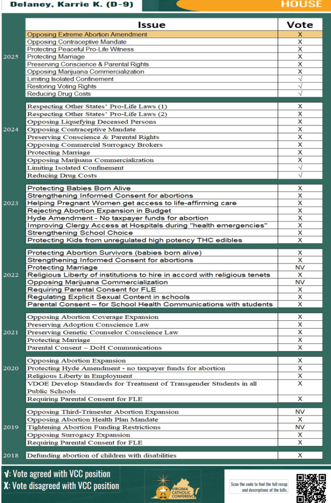On Karrie Delaney’s official House of Delegate Biography page, Delaney identifies as a Catholic. But her voting record reveals that partisan ideology, not the tenets of the Catholic faith or concern for children and families guides her votes.
