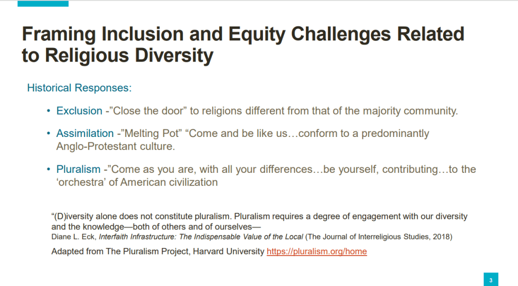 An example of this confusion and perhaps, hostility: in 2022, the FCPS School Board changed FCPS Spring Break Holiday from its traditional week — Holy Week. Students reported they were told that it was because the schools did not want it linked to the Christian Holiday of Easter, violating its “Equity” policy. A PowerPoint presentation of the Board’s Calendar Committee seems to confirm this interpretation. Framing Inclusion and Equity appears to require rejecting the “Historical Responses” it called “exclusion” and “assimilation” (institutional oppression) and opting for “pluralism”: