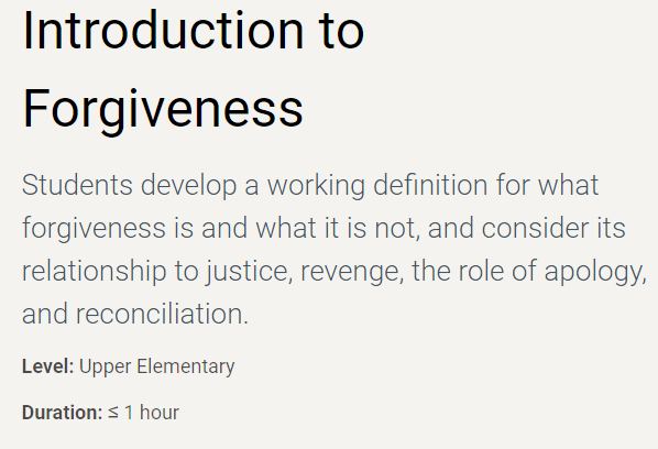 In contrast, here is a sample SEL Program on Forgiveness from Greater Good in Education produced by UC Berkeley’s Greater Good Science Center (GGSC). It is reflective of standard SEL curricula that is taught in public schools .