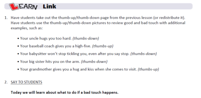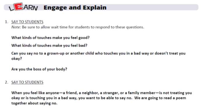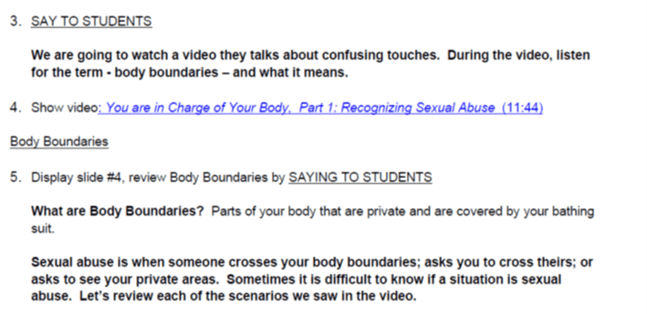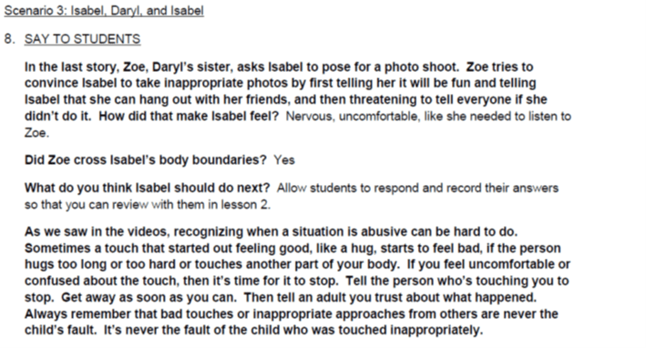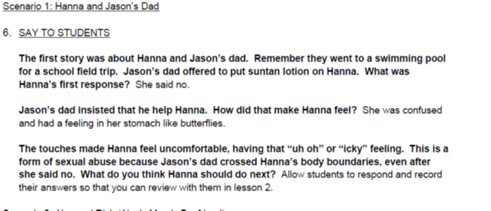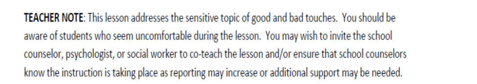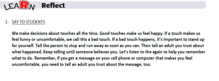 The topics covered in these lessons elicit discomfort from children because they violate the child’s innocence and tranquility. There is institutional bias in the schools that the school must protect children from their parents. A child who shows discomfort in a lesson on child sexual abuse will be interrogated by the school counselors because it indicates “reporting may increase, or additional support may be needed”. In other words, the presumption will be that the discomfort is caused by a child being sexually abused, possibly by a parent, rather than spiritually assaulted by a well-meaning teacher. Therefore, initial discussions with your child following his/her discomfort will not likely include you or even be known by you as a parent.