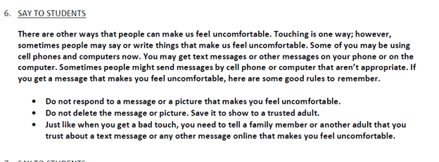 This lesson tells your 6-year-old they will be getting “inappropriate” messages on their cell phones and computers.