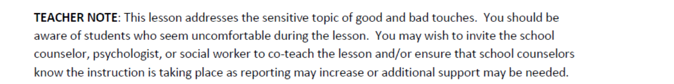 Are you aware that every year child abuse prevention (Good Touch, Bad Touch) classes are provided and a warning to teachers states: