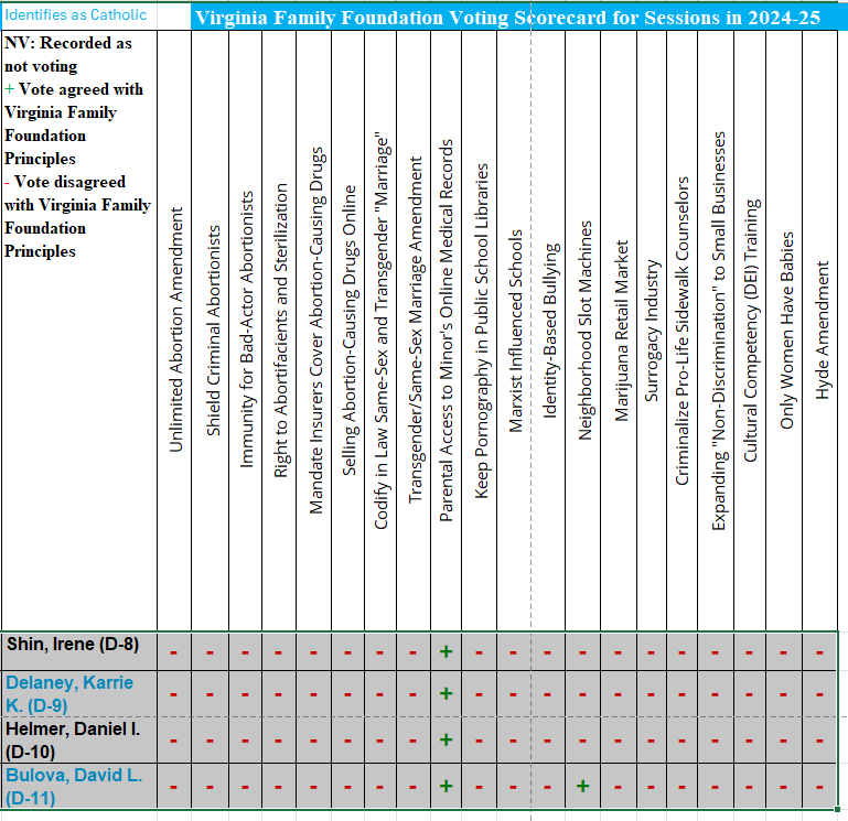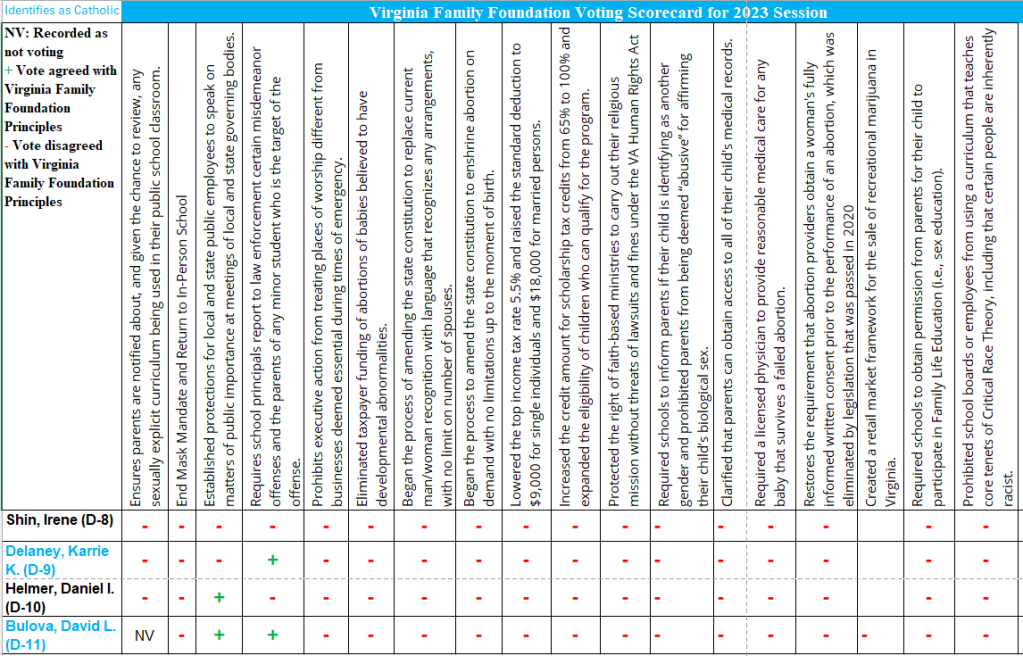 The Virginia Family Foundation records key votes in the Virginia General Assembly on critical issues impacting human life, parental rights and family impact. The charts below show the historic votes of Delegates and Senators in Western Fairfax County. A + indicates a vote supported by the Virginia Family Foundation. A – indicates a vote opposed by the Virginia Family Foundation.